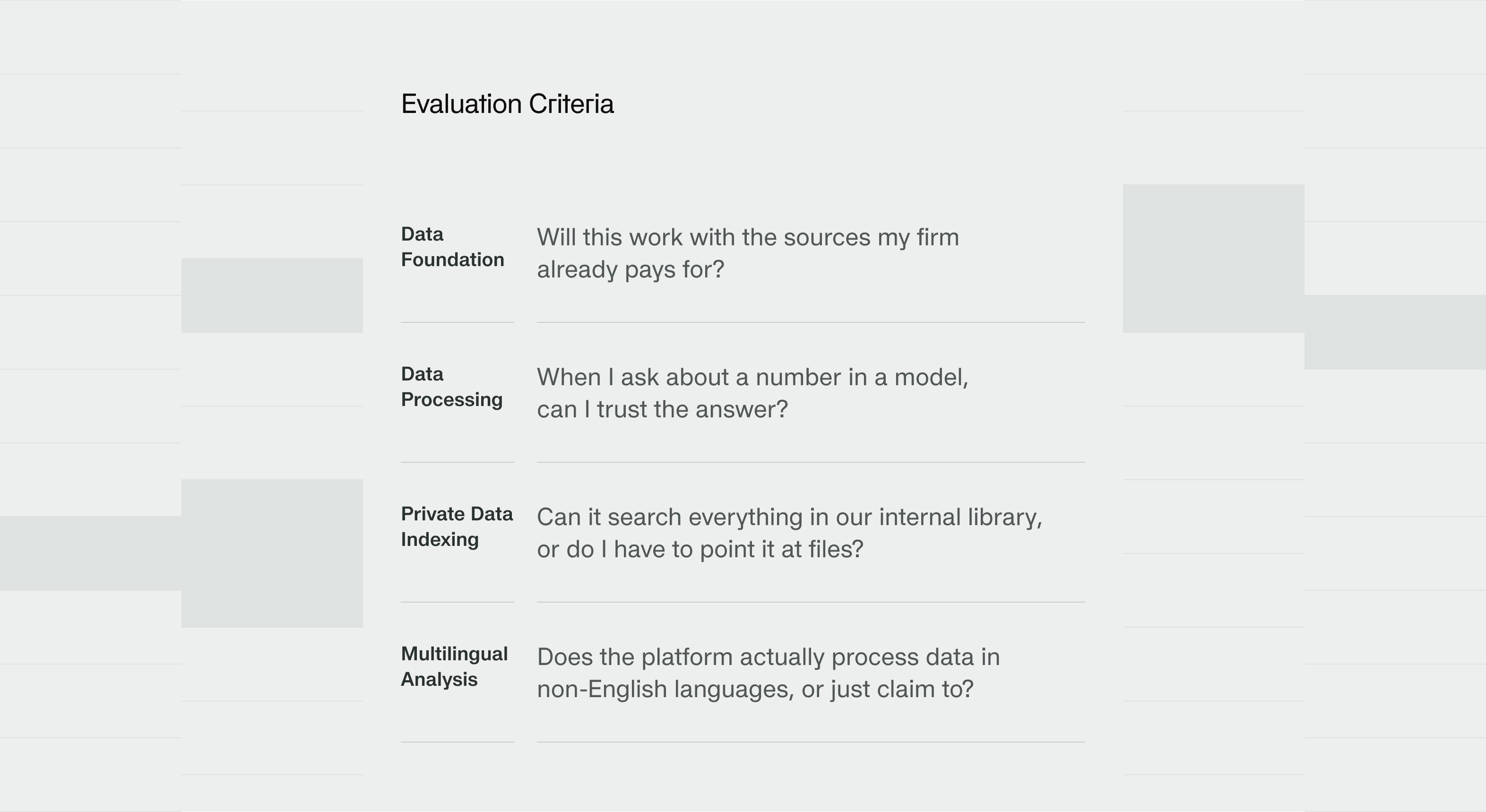 But vertical positioning alone doesn't mean a platform is the right fit for your firm. The differences that matter are in the architecture: what data the platform actually connects to, how it handles your internal documents, whether it processes structured financial data correctly, and whether it works in the languages your team operates in.
