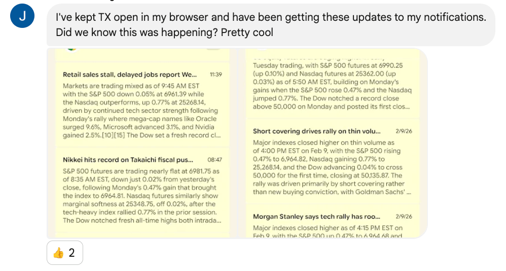 In a market where information is alpha, Terminal X notifications ensure you're never the last to know. Whether you're at your desk or on the go, breaking earnings, CEO changes, and sector rotations reach you instantly.