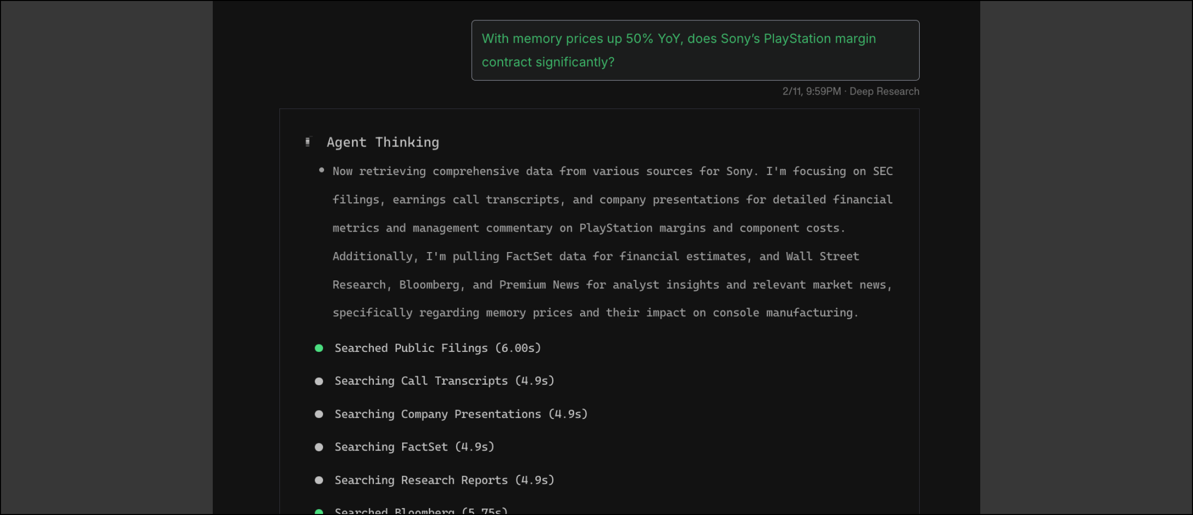 Terminal X’s default mode is Deep Research, which uses our most advanced reasoning model and premium data sources to deliver significantly more detailed, in-depth answers.