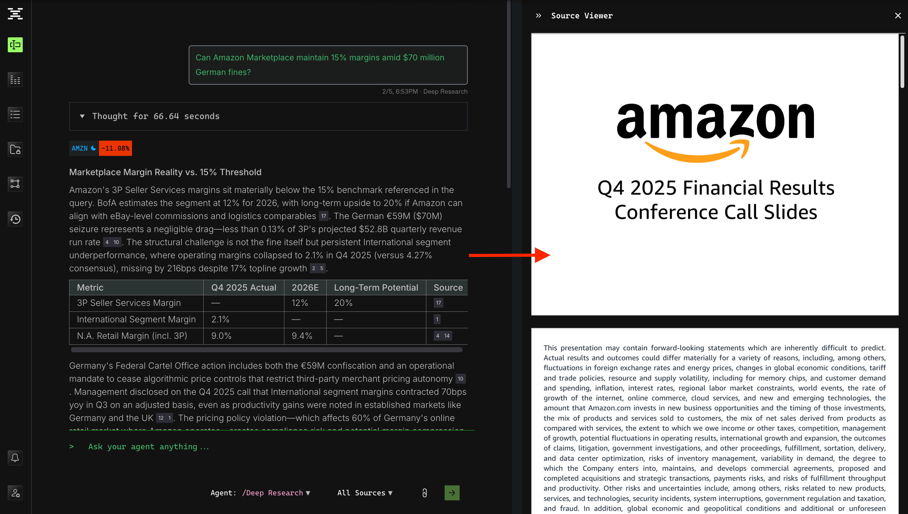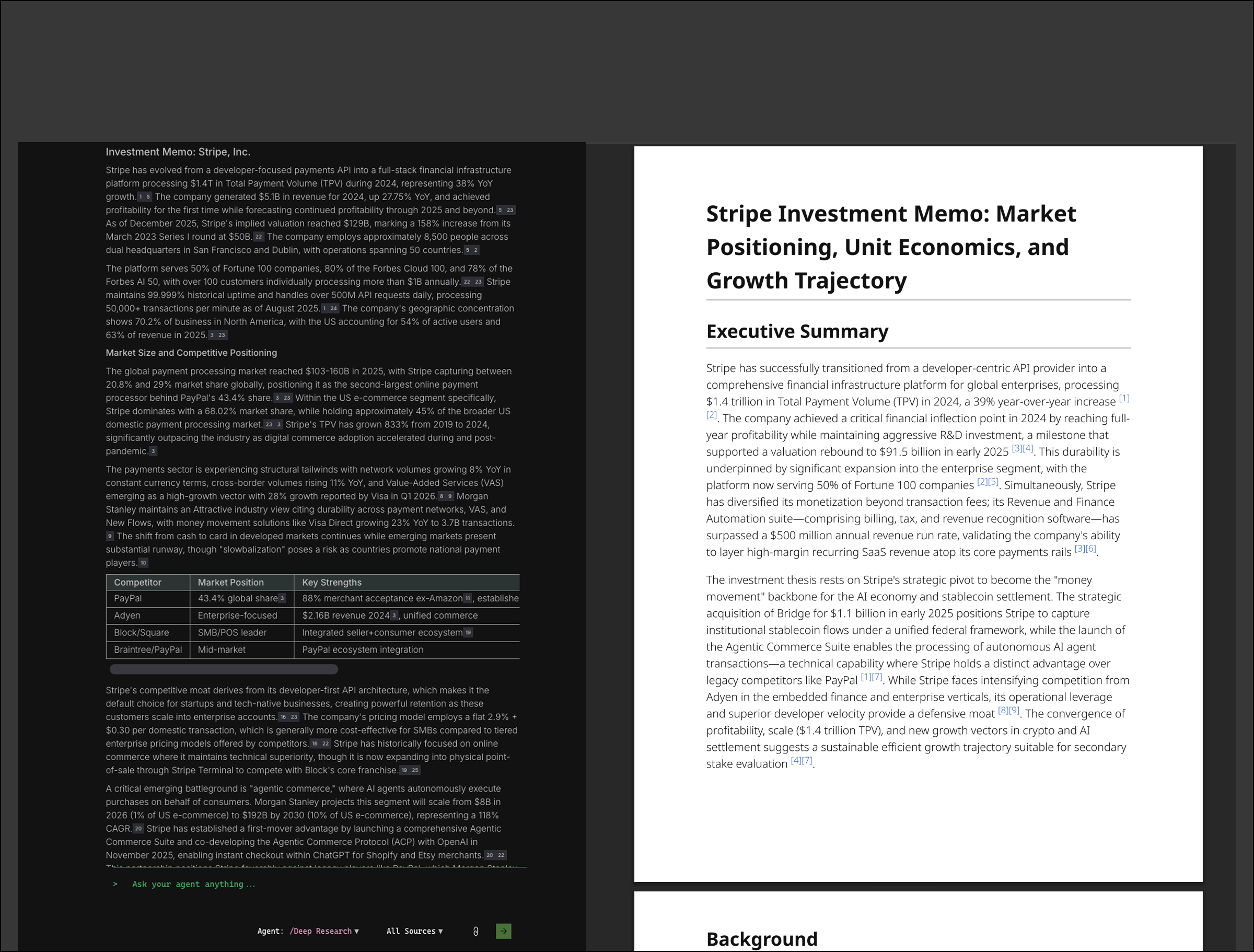 In the chat interface on the left, you can conduct research and ask Agent any followup questions.