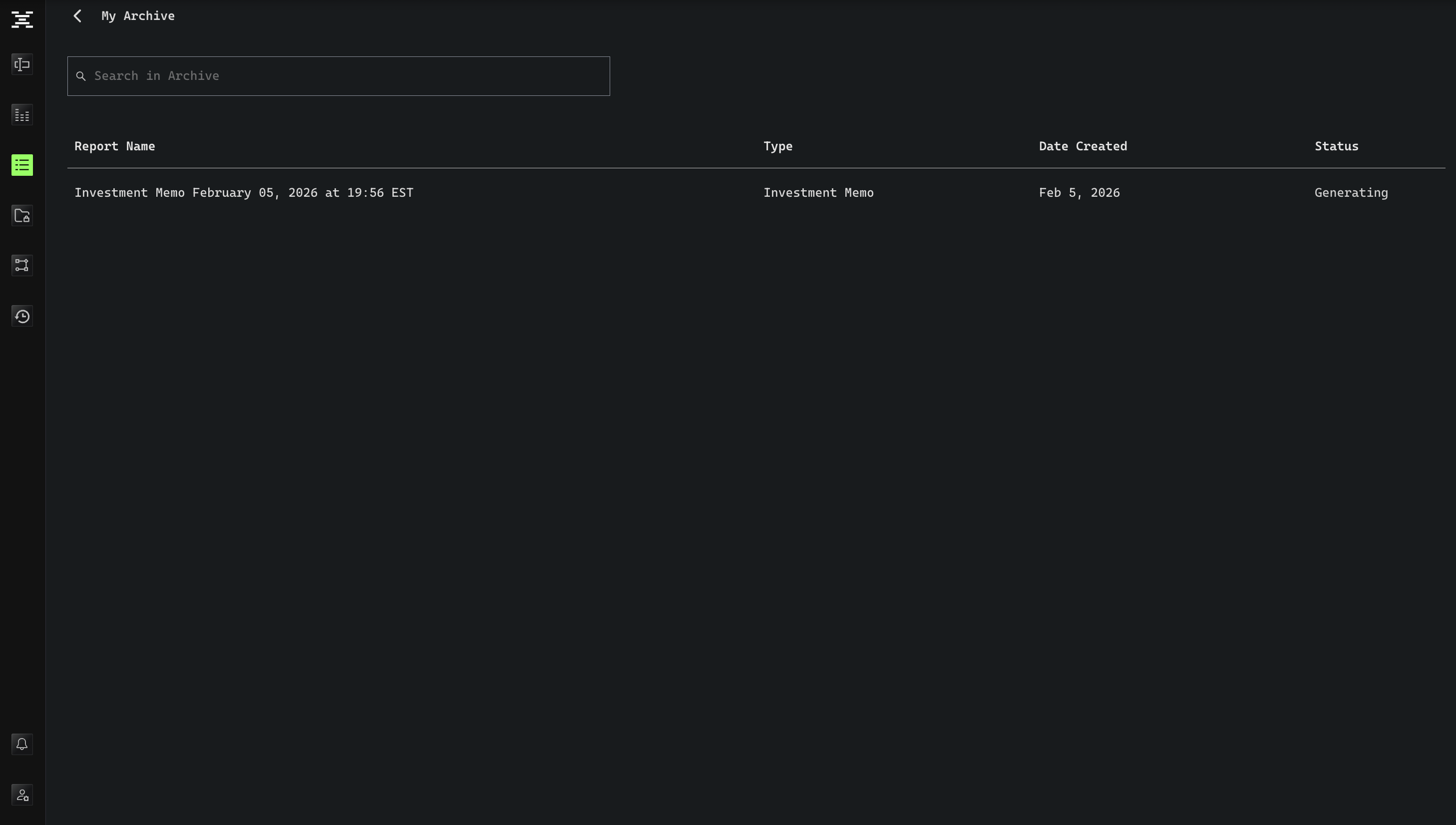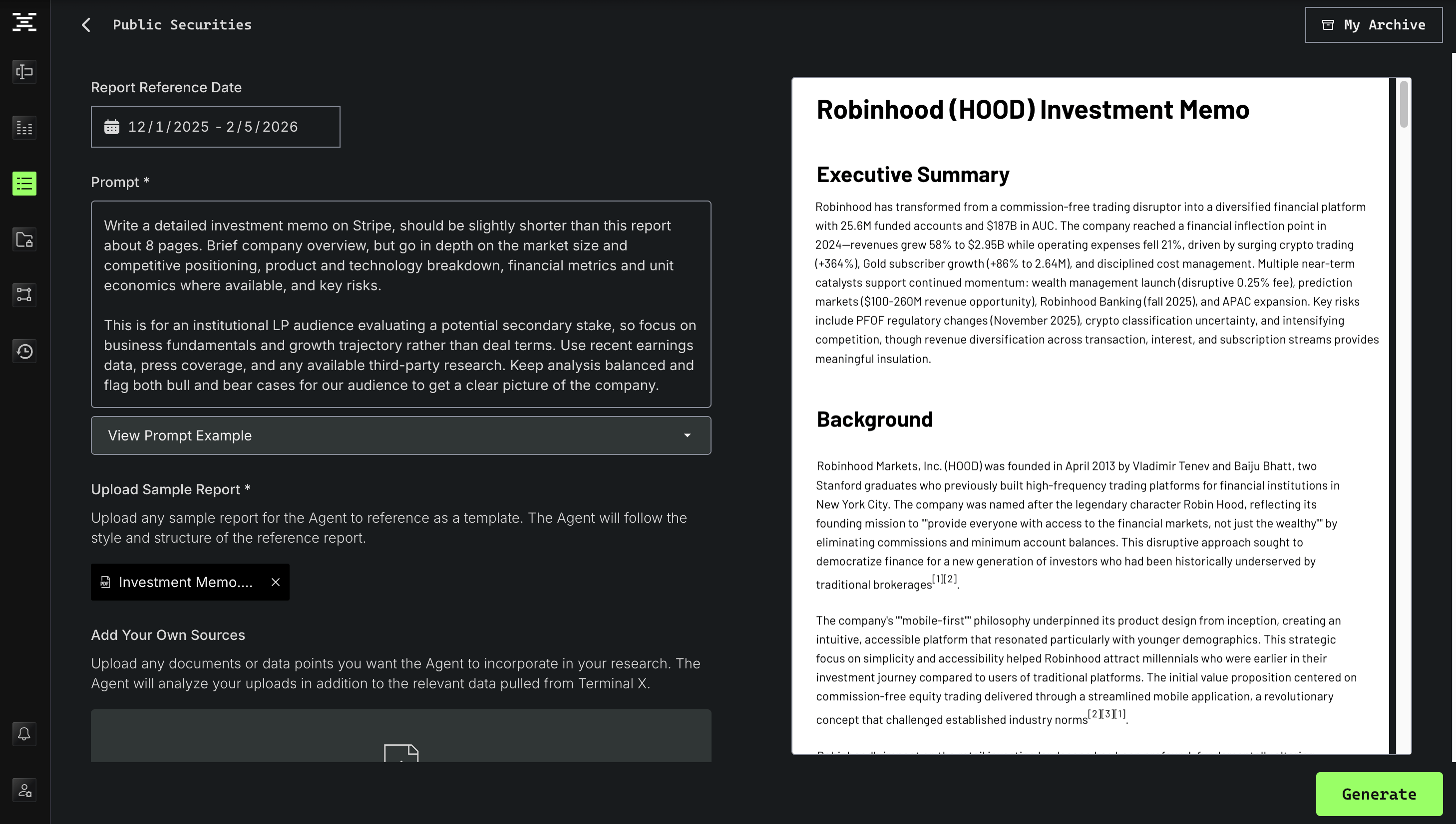 Click Generate to start creating your report. Once complete, it will appear in My Archive. You can continue working elsewhere in Terminal X while the report generates in the background.