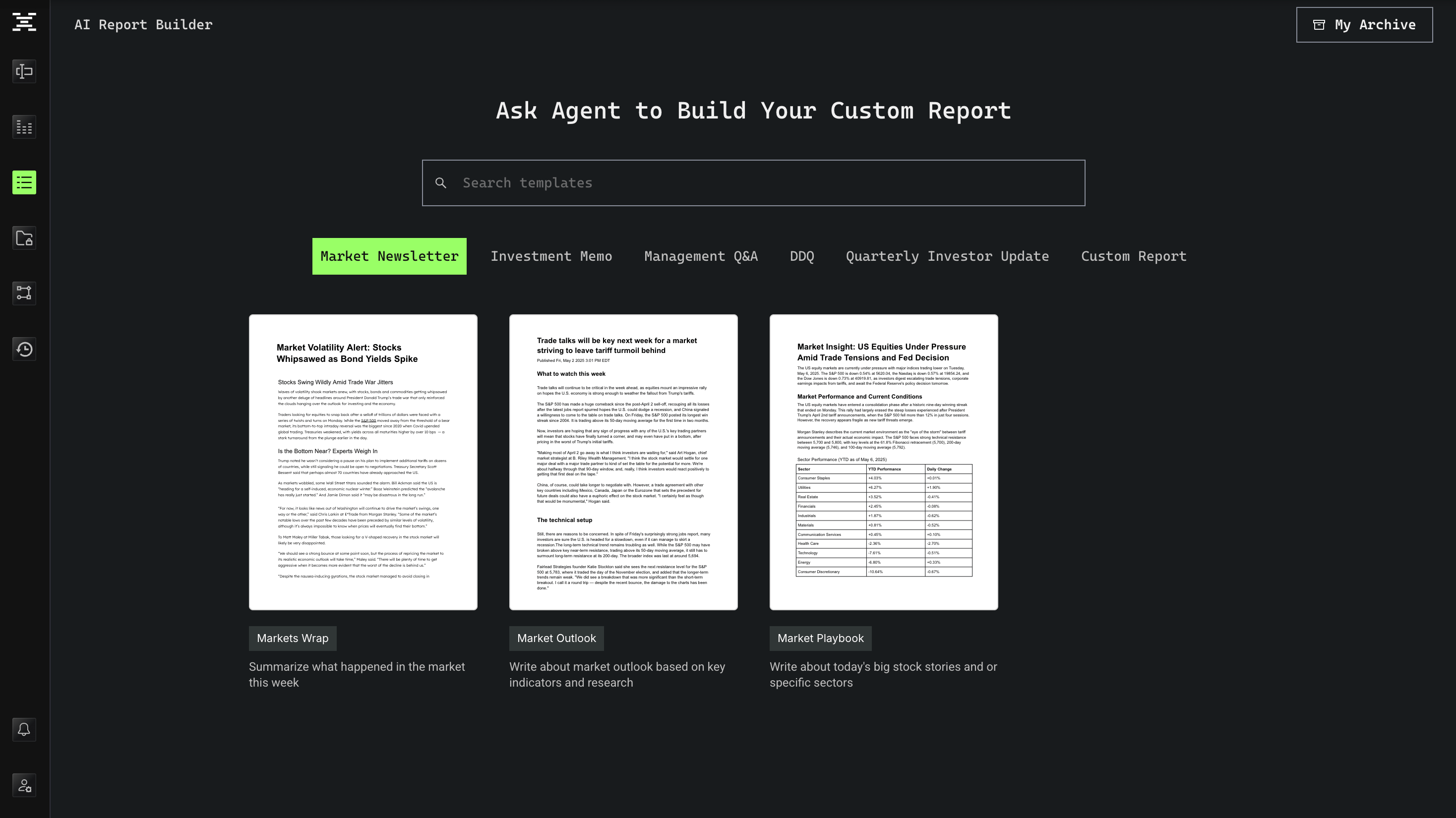 Custom Report enables you to automate market letters, IC memos, due diligence questionnaires, and more. The Agent leverages both Terminal X’s premium data sources and your indexed internal data to generate polished, export-ready documents that match your firm’s existing format and tone.