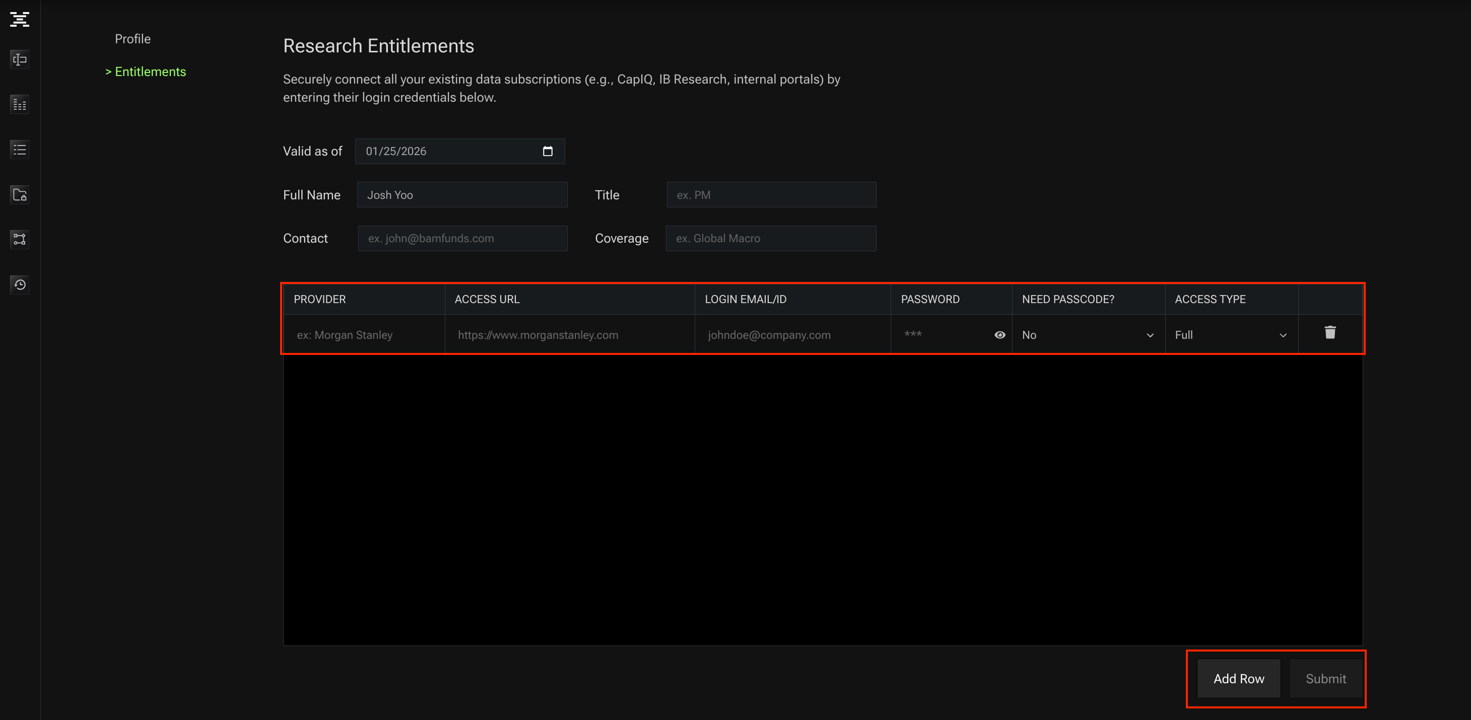 If there are additional public sources or private/company-level subscriptions you would like to connect, enter the login credentials through our secure, encrypted environment.