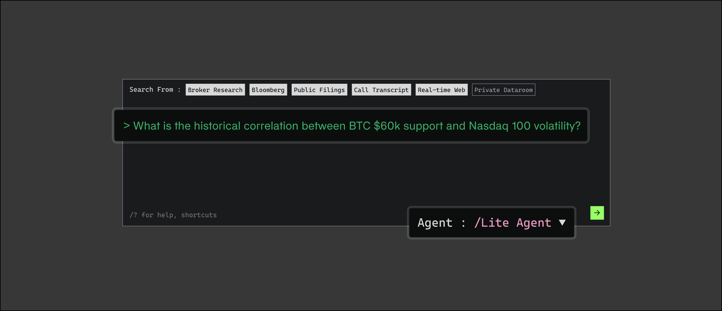 In the main search bar, you can access both of our AI Agents (Deep Research and Lite) built to think like an analyst and work at machine scale.