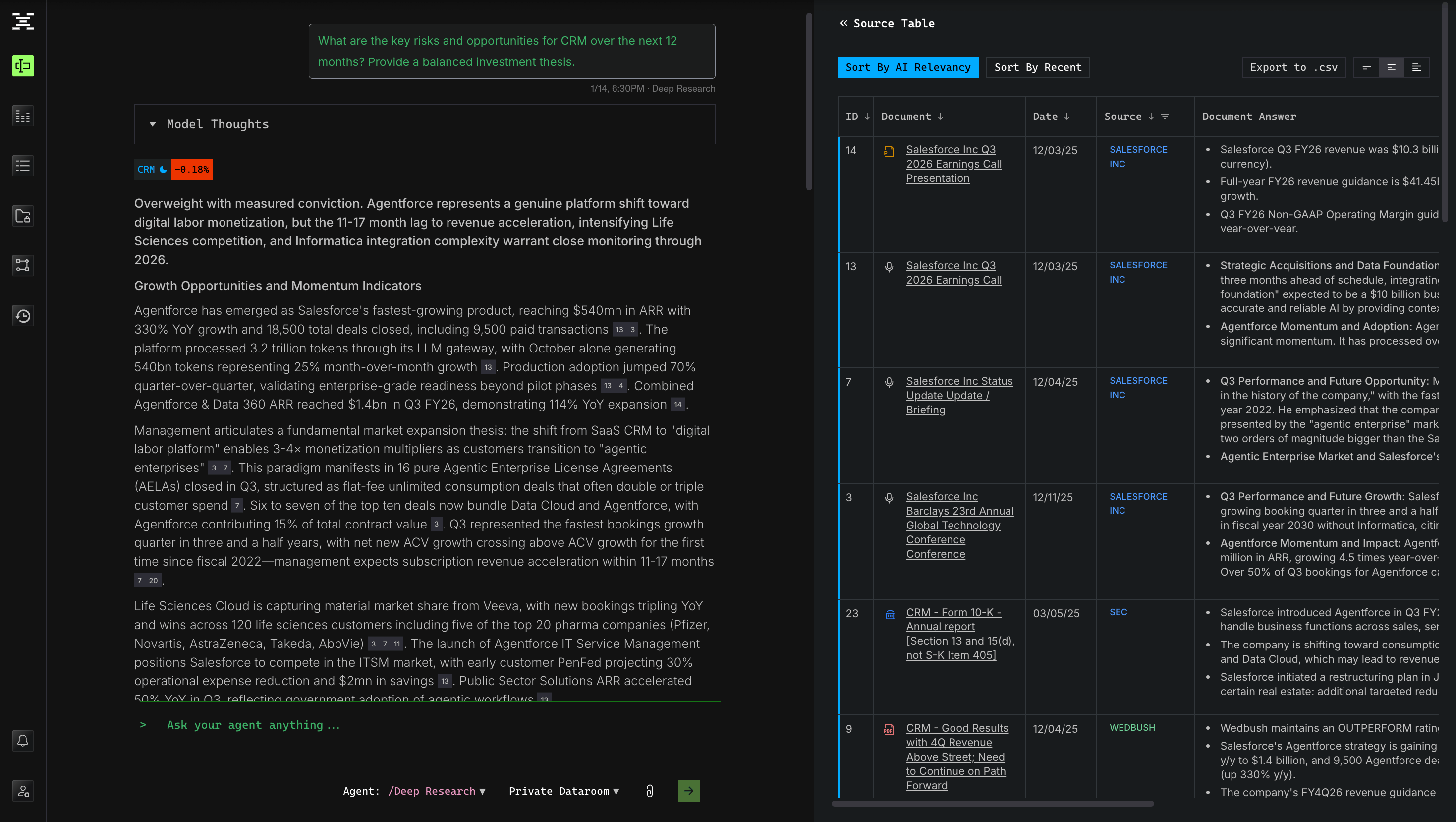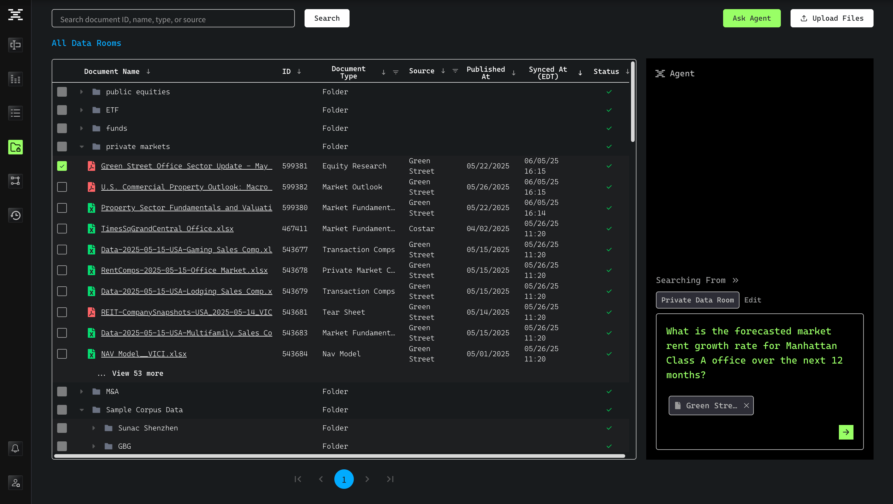 While the Agent already has access to robust premium real-time market data, true value is unlocked when it has your firm’s internal data synced through the Private Data Room (PDR). Essentially, acting as your firm’s real intelligence layer.