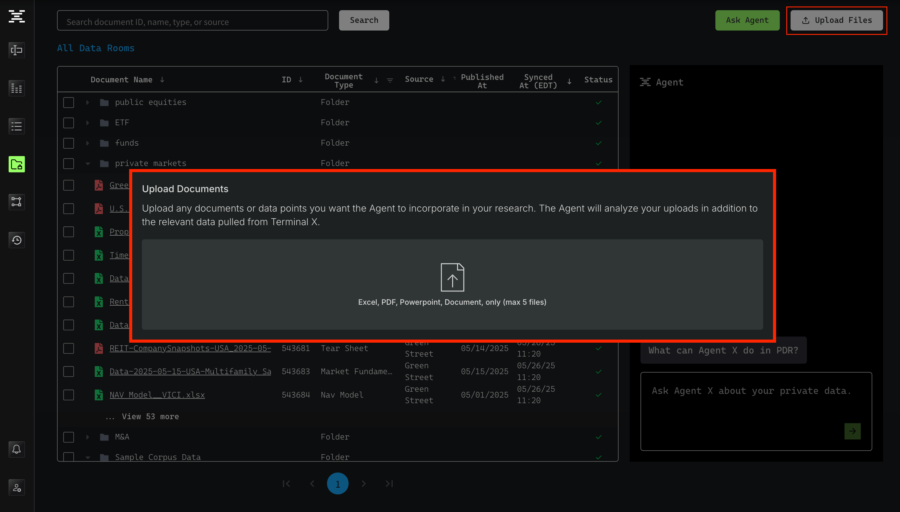 The example screen shown below uses mock data for demonstration purposes. In practice, we directly index your company’s internal data, folders, and drives within Terminal X. You can select specific PDR files or folders and ask the Agent questions based on those sources. You may also upload files directly to run Agent Q&A on your own documents.