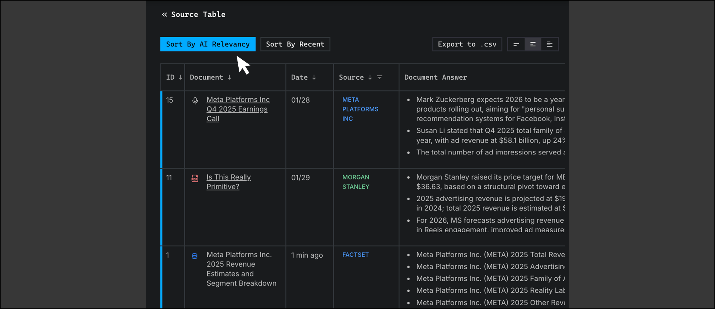 Clicking the “Sort by AI Relevance” button sorts the source documents and answers in the Source Table based on Terminal X’s relevance algorithm. To view the most recent sources instead, click “Sort by Recent.”