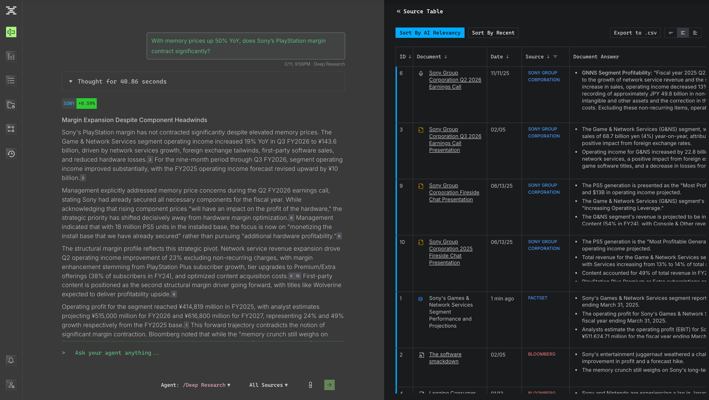 A key differentiator of the Terminal X Agent UX/UI is that, as answers are generated, a “Source Table” appears on the right side, providing document-level analysis and “ground-truth” references to audit simultaneously.