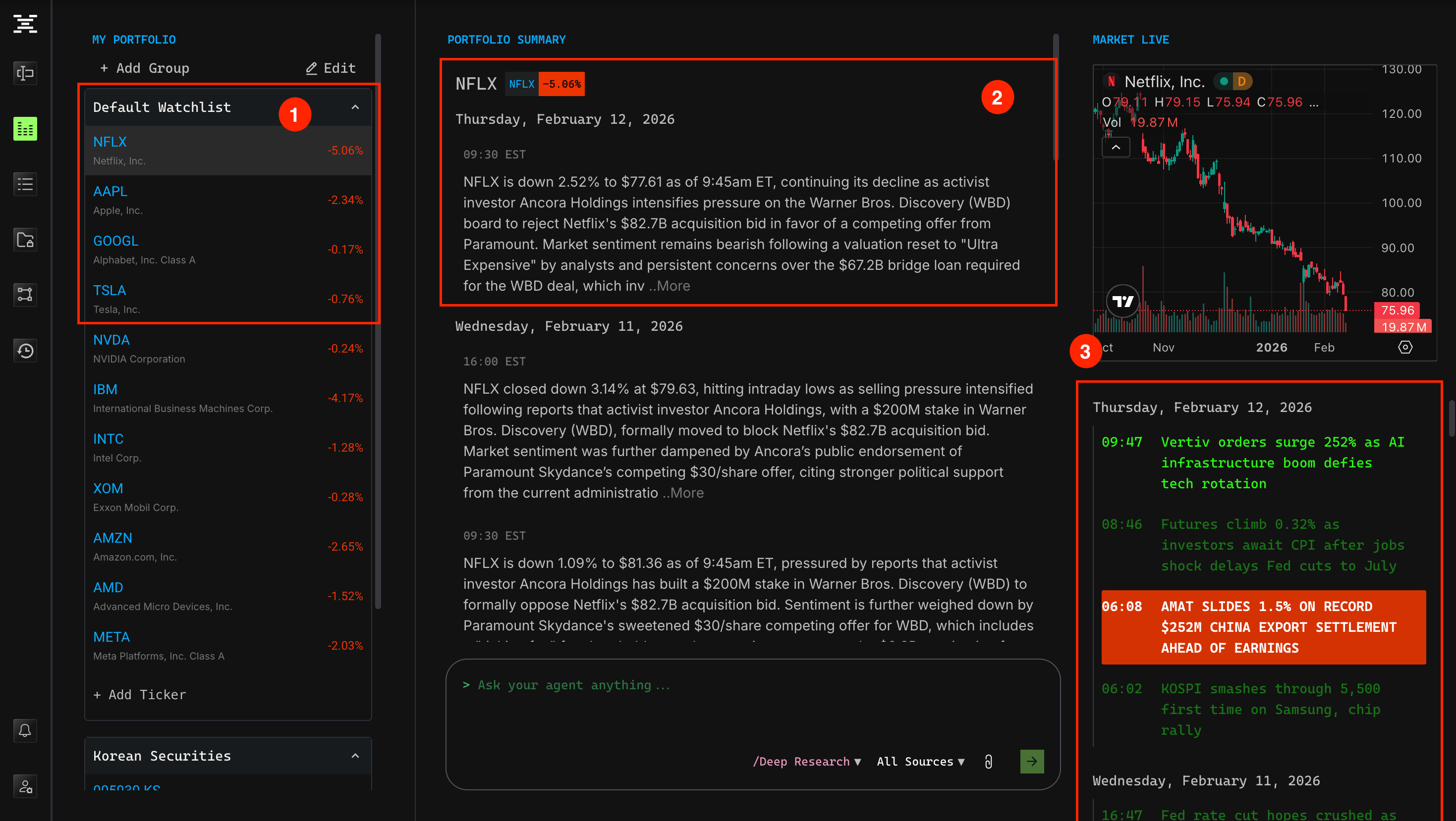 The Watchlist tab is a dedicated, real-time insight feed for your portfolio. It monitors price movements, news, and events for your selected tickers, and provides premium data–driven analysis that instantly explains why a stock is moving.